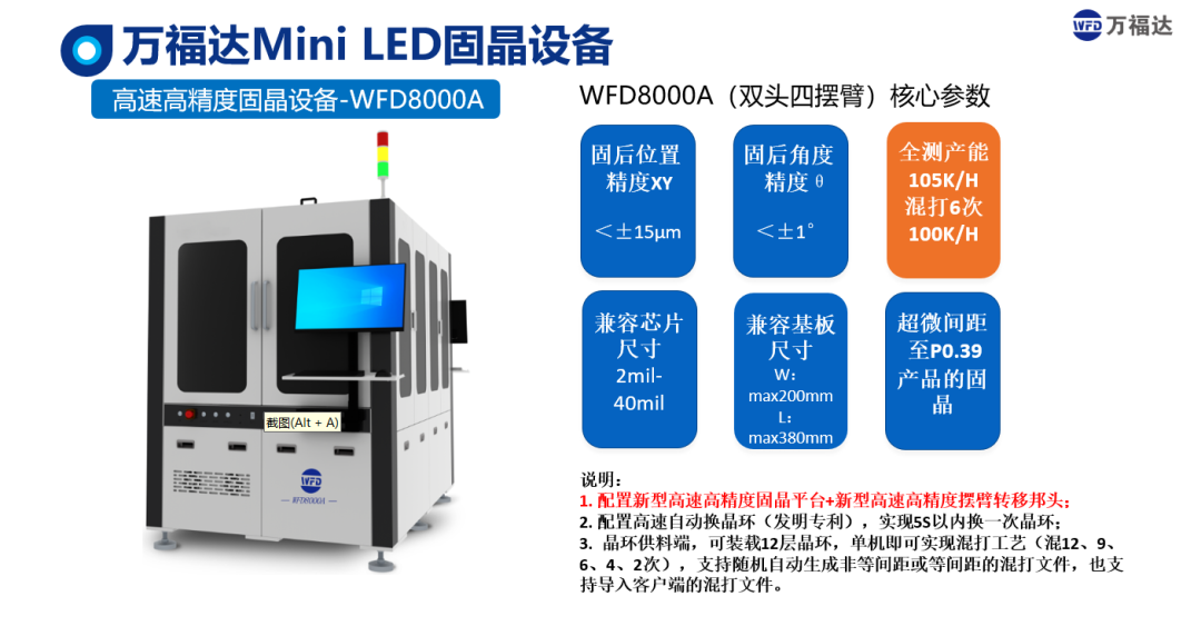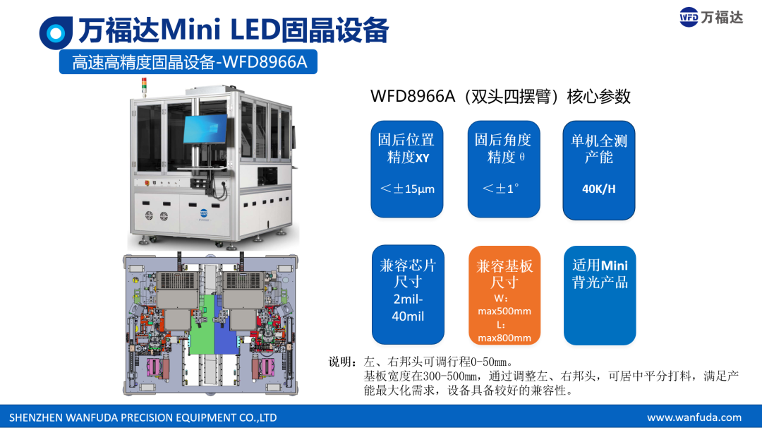 萬福達(dá)Mini LED直顯產(chǎn)品主要有WFD8970B/WFD8916A/WFD8971A/WFD8976A/WFD8000A/WFD3000A等系列產(chǎn)品,WFD8970B是公司很多客戶正在使用的一款熱門設(shè)備,我們優(yōu)勢在于擁有較高且穩(wěn)定的固晶精度XYθ,可以做到同行領(lǐng)先的單機(jī)雙頭四擺臂全測產(chǎn)能80K/H,混打6次75K/H,我們可兼容到客戶的超微間距P0.3產(chǎn)品。WFD8916A通過3臺8970B組合,組合后實(shí)現(xiàn)六頭十二擺臂全測產(chǎn)能高達(dá)225K/H以上。WFD8971A面向Mini LED直顯客戶定制化的方向,兼容基板尺寸從W:max220mm,L:max260mm 擴(kuò)展到W:max220mm,L:max380mm。WFD8976A基于無載板玻璃基產(chǎn)品的固晶 ,定制化機(jī)械手+雙料盒模塊,實(shí)現(xiàn)全自動化上、下料。WFD8000A配置新型高速高精度固晶平臺+新型高速高精度擺臂轉(zhuǎn)移邦頭,全測產(chǎn)能105K/H;擁有高速自動換晶環(huán)實(shí)現(xiàn)5S以內(nèi)換一次晶環(huán);支持隨機(jī)自動生成非等間距或等間距的混打文件,也支持導(dǎo)入客戶端的混打文件。WFD3000A(巨量轉(zhuǎn)移)在保證現(xiàn)有設(shè)備的精度及穩(wěn)定性優(yōu)勢,公司不斷創(chuàng)新突破,提升設(shè)備的產(chǎn)能,用于0305、0408芯片量產(chǎn)產(chǎn)品的固晶,并且向下可兼容超小芯片(2mil以下),超微間距Micro LED產(chǎn)品的固晶。