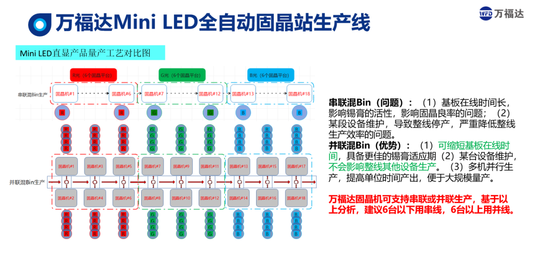 萬福達(dá)Mini LED全自動固晶站生產(chǎn)線,我們常見的方式是串聯(lián)和并聯(lián),串聯(lián)的話我們建議6臺以下使用,6臺以上大規(guī)模多機(jī)生產(chǎn),我們建議使用并聯(lián)方式,并聯(lián)我們采用的18臺的組合,很好的解決錫膏適應(yīng)期的問題,同時減少基板的在線時間,如果出現(xiàn)單臺設(shè)備維護(hù),不會影響整線其他設(shè)備生產(chǎn),封閉式全自動基板輸送線體結(jié)構(gòu)設(shè)計(jì)簡單,易操作,易維護(hù)。
